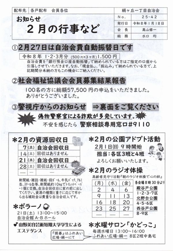 2026年(令和8年)1月の自治会の予定などです。