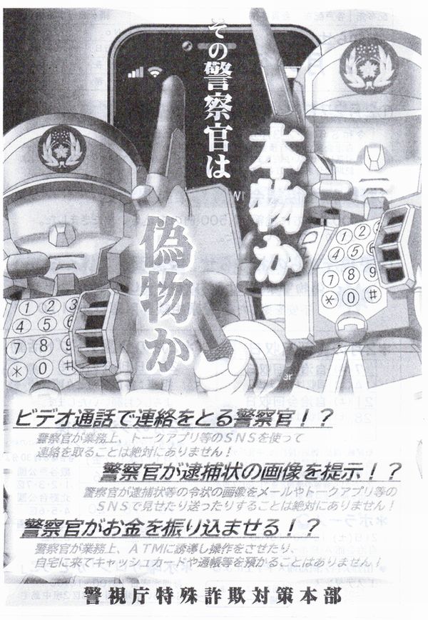 また、「偽物警察官による詐欺」が多発しています。①SNSで連絡を取ることはありません!②逮捕状を画像で見せることはありません!③お金を振り込ませることはありません!警察官はこんなことはしません。不安を感じたら警察相談窓口#9110へ。