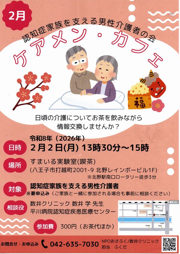 2月2日(月)に「ケアメン・カフェ」が行われます。「ケアメン・カフェ」は、「NPOおさふく」が主催する認知症家族を支える男性介護者の皆さんの情報交換を行いながら専門の医師からお話を聞くことができる場です。認知症家族を支える男性介護者で、お悩みや聞いてみたいことがあるという方は、事前の申し込み行っていただき、「ケアメン・カフェ」に参加してみてはいかがでしょうか。
