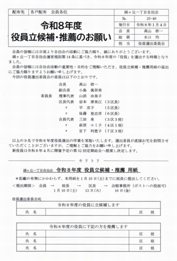 令和8年度役委員の立候補、推薦のお願いです。締め切り日、1月10日までに指定の用紙に氏名などを記載し、班長さんまたは、自治会館までご提出ください。よろしくお願いいたします。