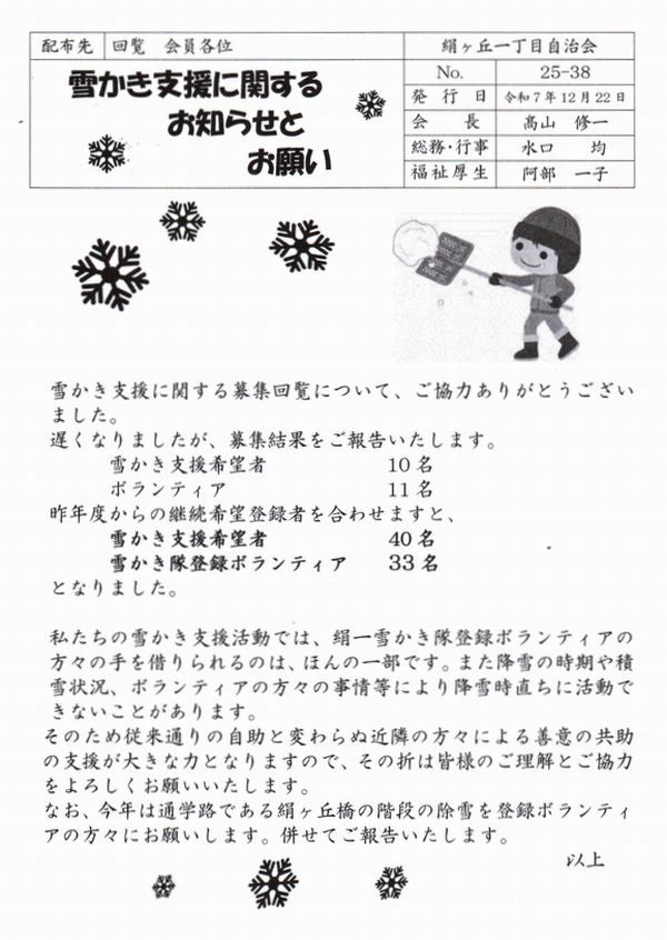 今年も雪かき支援の募集を行った結果、これまでの継続登録者に、新たに雪かき希望者、10名、雪かきボランティア、11名の方々が加わりました。雪かき登録されている方は、一部の方々で、ほとんどの地域は支援対象外です。雪かきは、まず自助、そして近隣の共助が大切です。皆様の雪かきに対するご理解とご協力をお願いいたします。