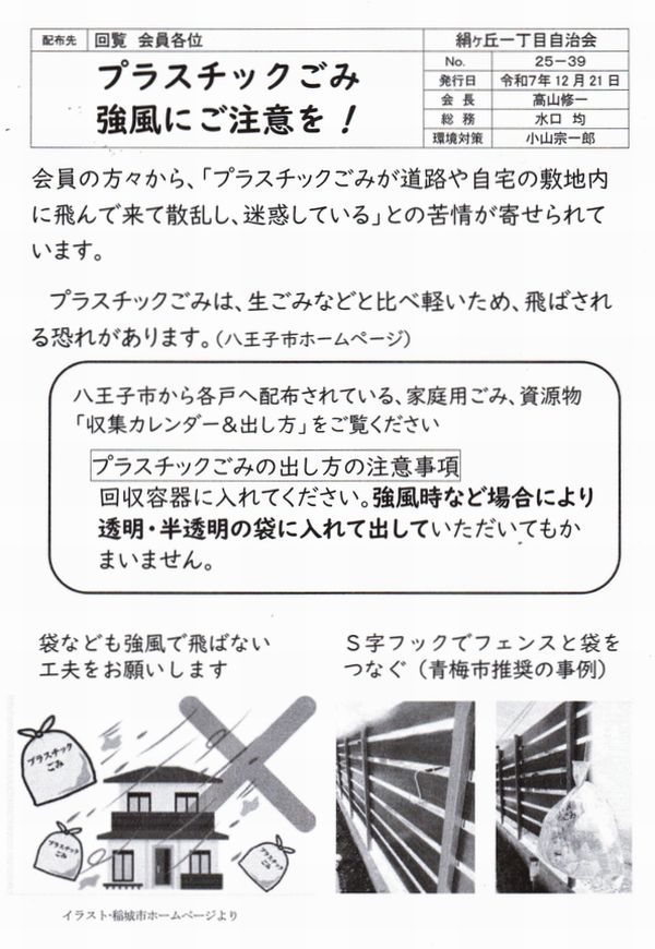 「プラステチックごみ」が強風などにより、周辺に散乱しているという苦情が寄せられています。軽くて散乱しやすい「プラスティックごみ」の取り扱いに、注意をお願いいたします。