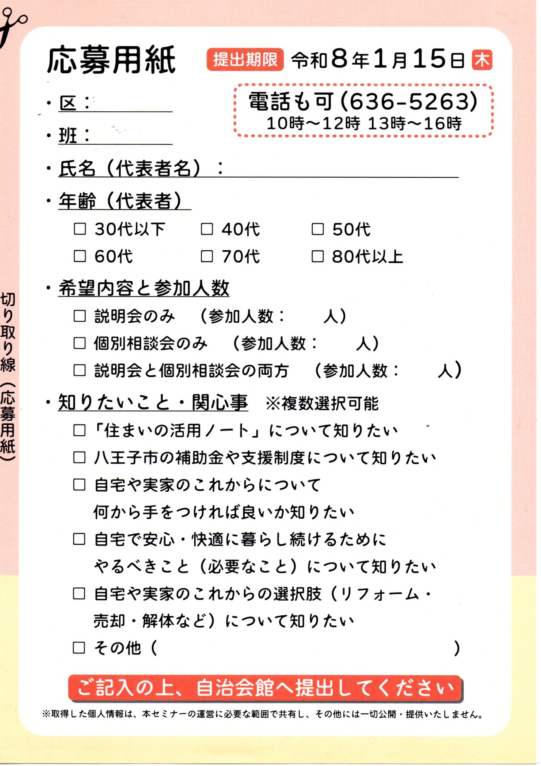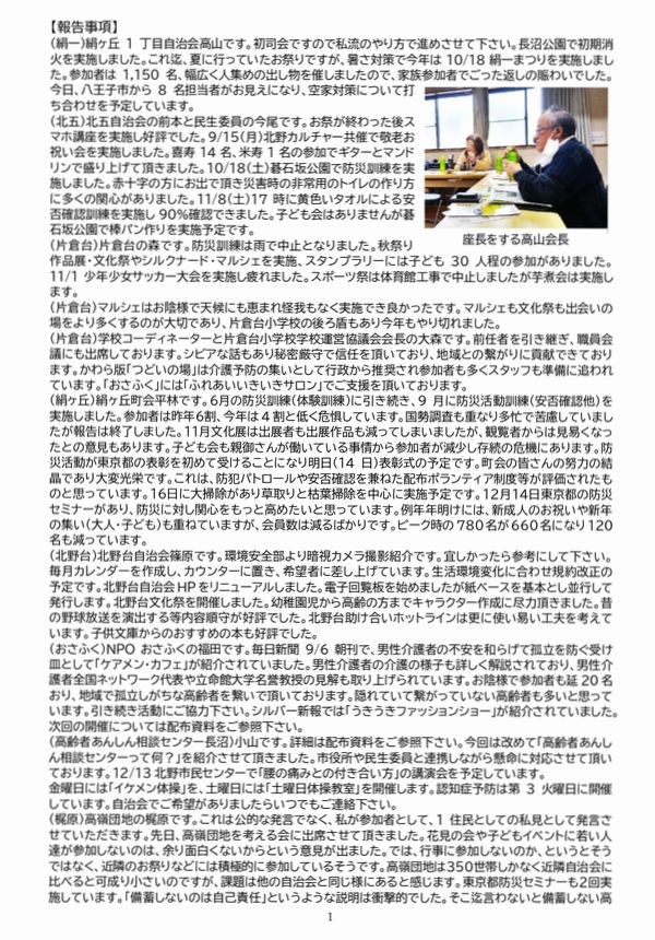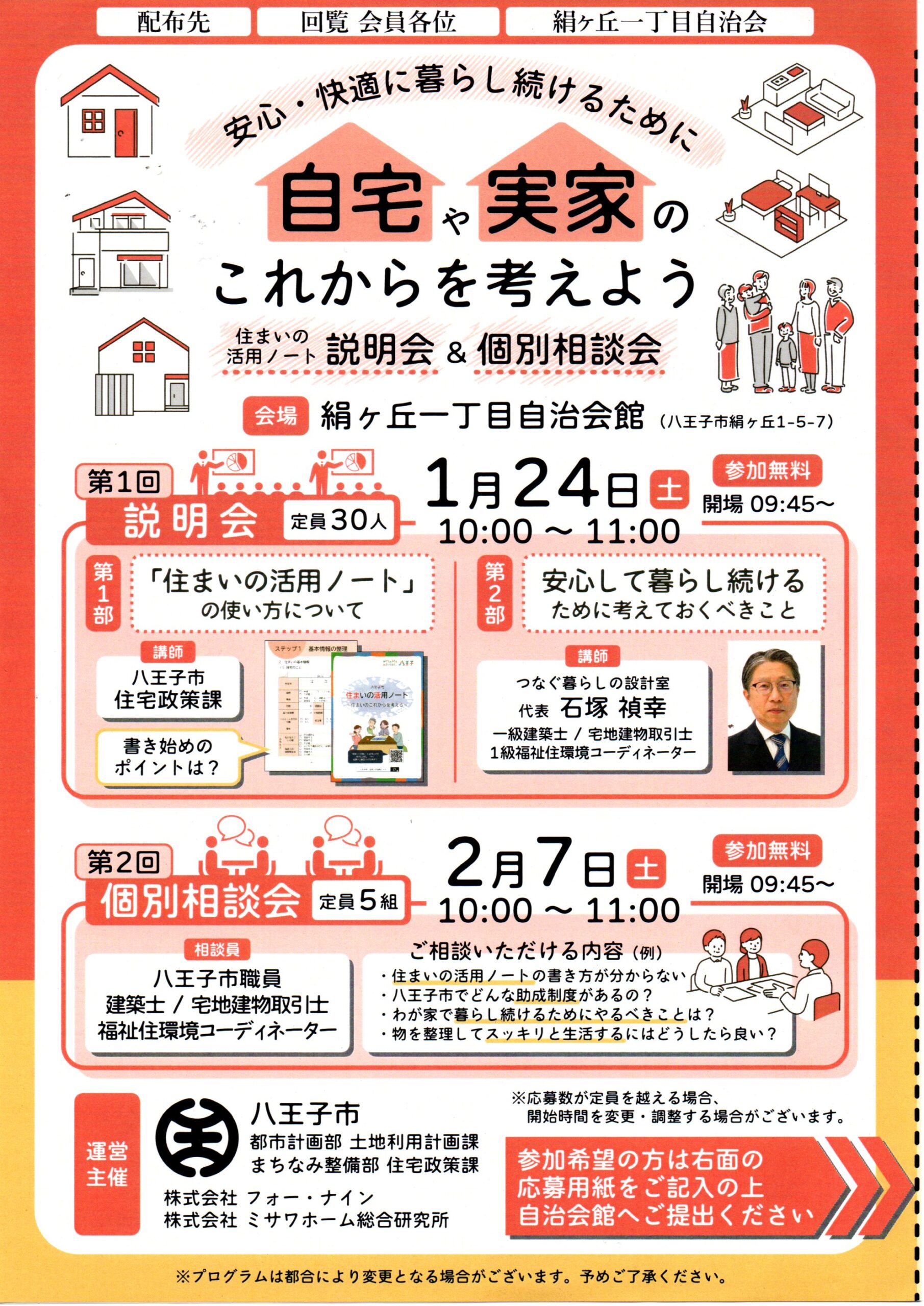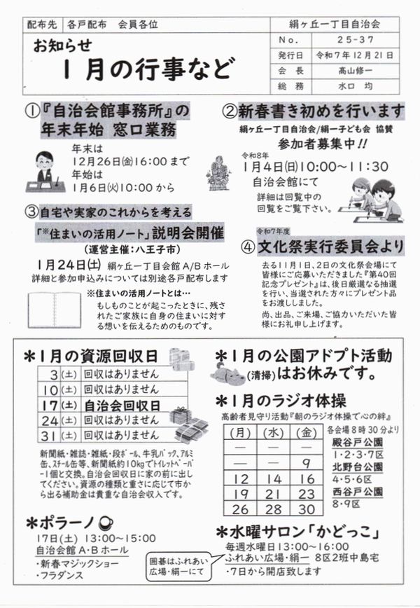 1月は、4日(日)に恒例の新春書初め会があります。また、24日(土)には、八王子市が主催して 「自宅や実家のこれからを考えよう」と題し、安心して、快適に暮らし続けるための住まいの活用説明会と個別相談会が自治会館で開催されます。