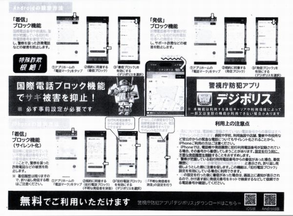 警視庁防犯アプリ「デジポリス」をご存じですか。電話による特殊詐欺は「国際電話」を使って行われることが多いといわれています。こうした国際電話を用いた特殊詐欺への根本的な対策は、「国際電話を一括で着信拒否すること」しかありません。警視庁防犯アプリ「デジポリス」は国際電話からの着信や送信などをブロックする機能を持っています。「デジポリス」かからない対策を行いましょう。