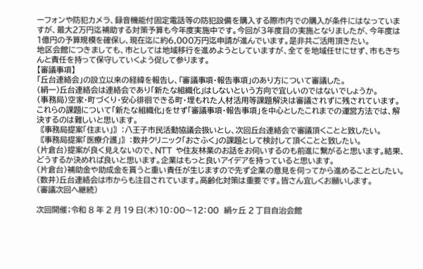 丘台連絡会が、11月13日(木)10時から、絹ヶ丘1丁目自治会館で行われました。
