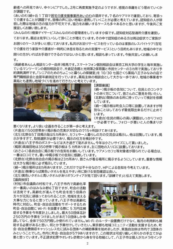 絹ヶ丘1丁目自治会(高山・阿部・野浦)、絹ヶ丘町会(平林)、北野台自治会(篠原)、北五自治会(前本・今尾)、片倉台自治会(森・阿部・大森)、高嶺団地自治会(梶原)、あんしん相談センター長沼(小山)、あんしん相談センター由井(相馬) 数井クリニック/NPOおさふく(数井・福田・大谷)、NPOみんなのわ(小俣)、あいのわ(酒井)、市会議員(村松)、事務局(廣川)
