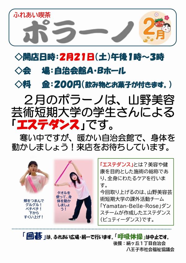 新年最初のポラーノは、華やかに「八王子マジシャンクラブ」によるマジックとお馴染み「プアナニフラスクール」の皆さんによるフラダンスを楽しんでいただきます。ポラーノ正月恒例の「お汁粉」も用意して皆様をお待ちしております。寒い時期ですが、自治会館までぜひ、足をお運びください。