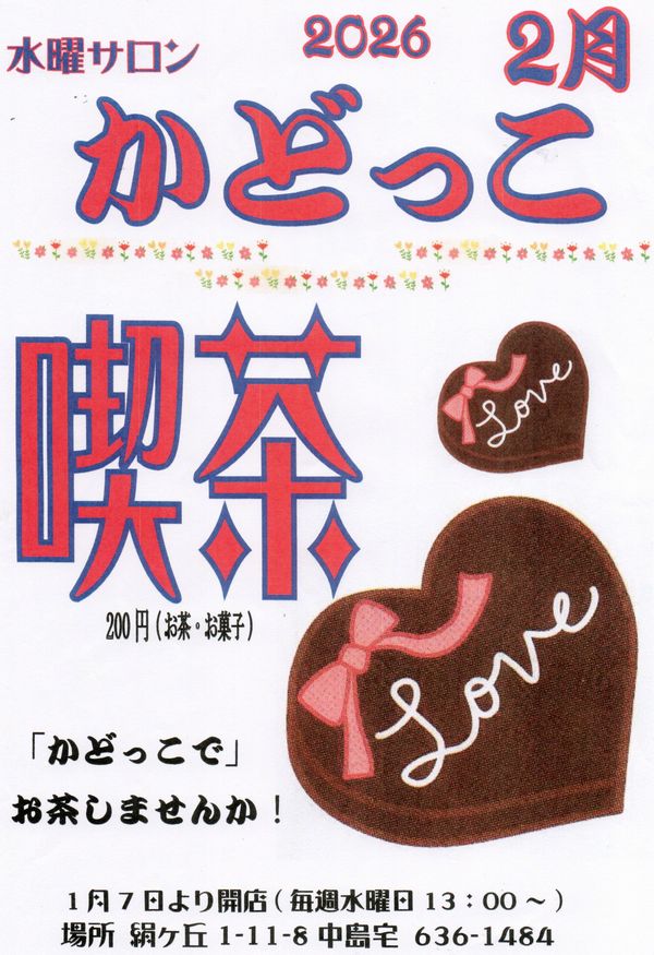 2月も「かどっこ」は毎週水曜日、午後1時から4時まで開店しています。