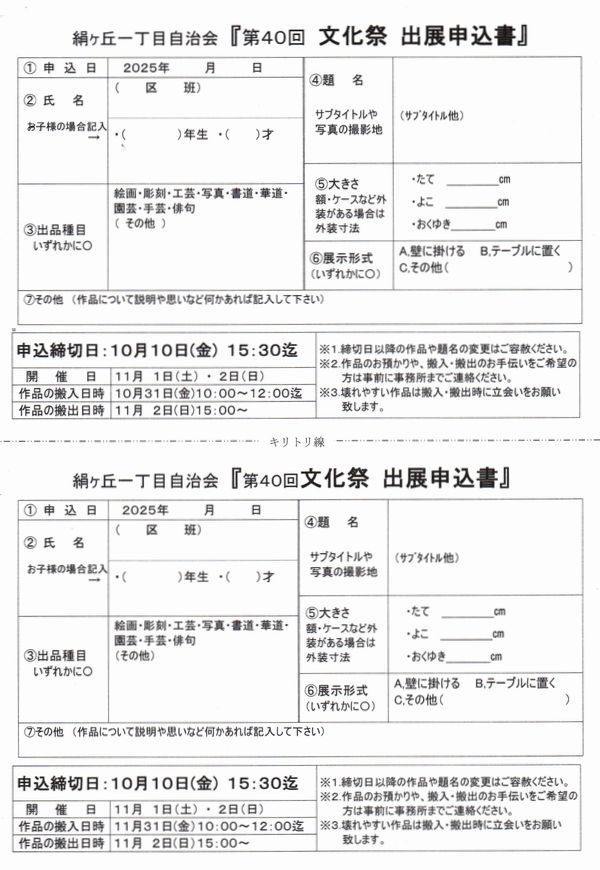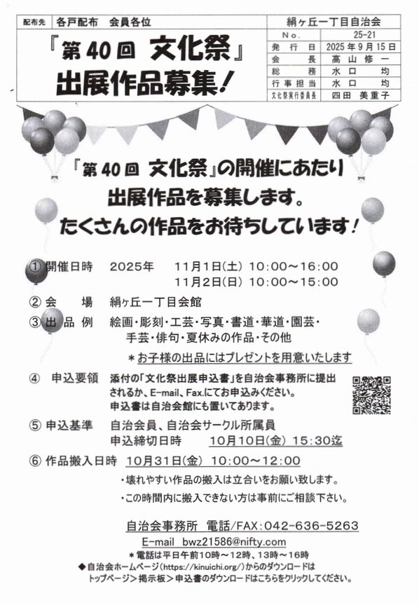 11月1日(土)、2日(日)は、「第40回文化祭」が開催されます。10月10日まで、皆さんからの出展作品の募集を行っています。文化祭のために作品の制作をしなくても何年も前に描いた絵や書、小物などの作品で結構です。皆様の出展をお待ちしております。