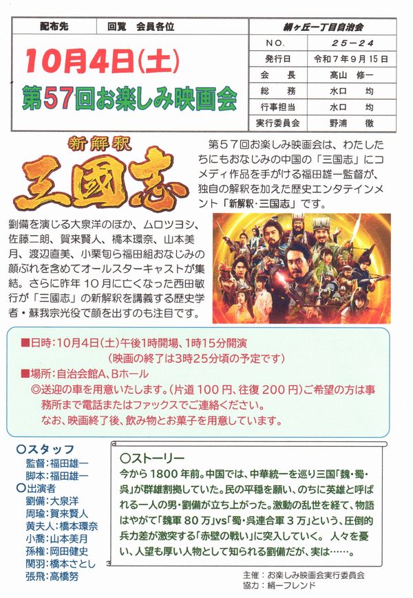 10月4に日(土)、第57回お楽しみ映画会が開催されます。今回取り上げる作品は、『新解釈三国志』です。この映画は、日本でも広く親しまれている中国の「三国志」に数々のコメディ作品を手がける福田雄一監督が独自の解釈を加え、主演の大泉洋とタッグを組んで描いた歴史エンタテインメントです。ぜひ自治会館まで足を運んでいただき楽しんでください。
