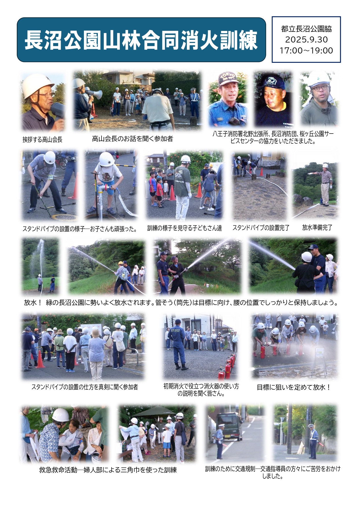 消火訓練は自治会として、毎年行っていますが、近年、山林火災が発生していることなどから、今回は山林火災を想定した消火訓練を実施しました。そのため、長沼公園を管理している桜ヶ丘公園サービスセンターの協力を得て、八王子消防署北野出張所、長沼消防団との合同消火訓練となりました。