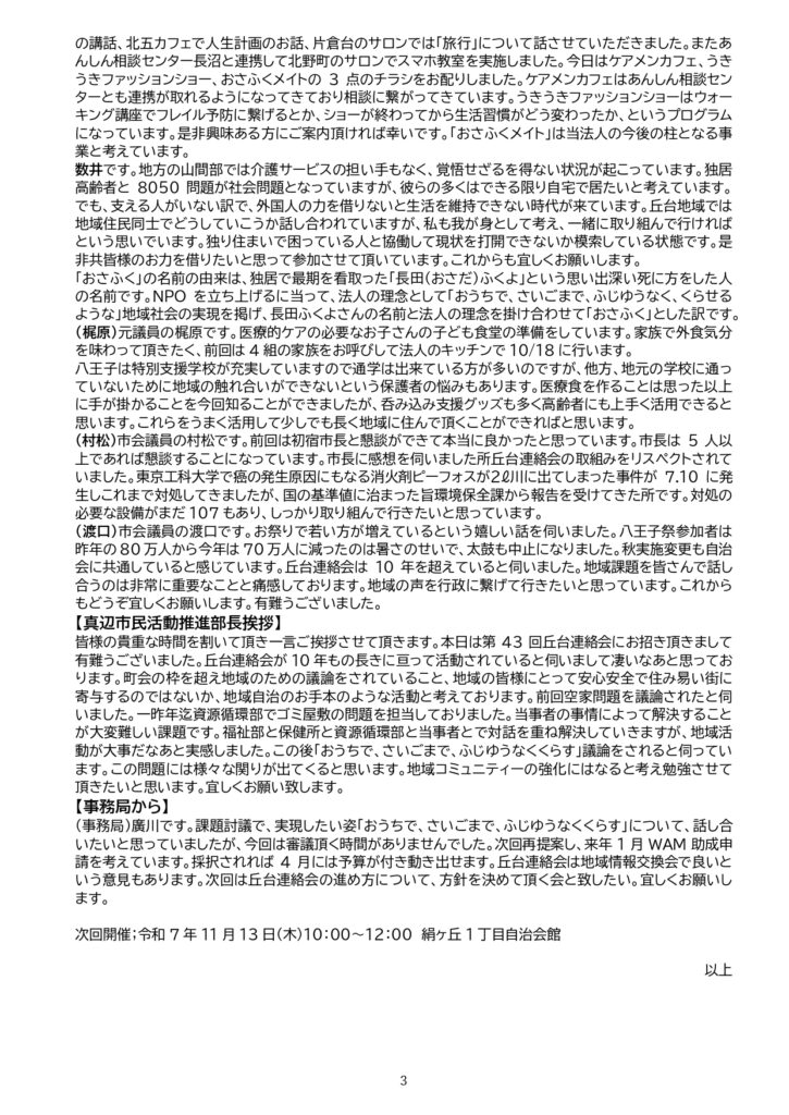 八王子市役所(真辺)・あんしん相談センター長沼(小山)・あんしん相談センター由井(佐藤)・元議員梶原・数井クリニック/NPOおさふく(数井・平川・福田・大谷)・北野台自治会(篠原)・北五自治会(前本・今尾)・絹ヶ丘1丁目自治会(吉田・高山・阿部・野浦)・絹ヶ丘町会(平林)・片倉台自治会(森・阿部・山本・大森)・高嶺団地(樋口・内田)・市会議員(村松・渡口)・NPOみんなのわ(小俣)・事務局(廣川)(敬称略)