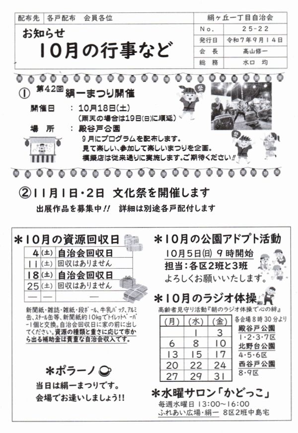 10月は、4日(土)に「お楽しみ映画会」が、そして、18日(土)はリニューアルした「絹一まつり」が行われます。10月は、いろいろな行事が行われます。暑かった夏もやっと終わって過ごしやすい季節となります。ぜひ、自治会の行事にもご参加ください。お待ちしております。