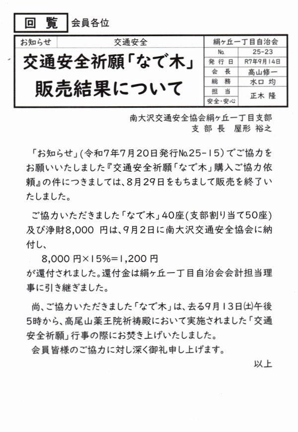 7月に実施した交通安全祈願「なで木」販売の結果を報告します。支部割当50座に対し40座が販売できました。皆様のご協力、ありがとうございました。