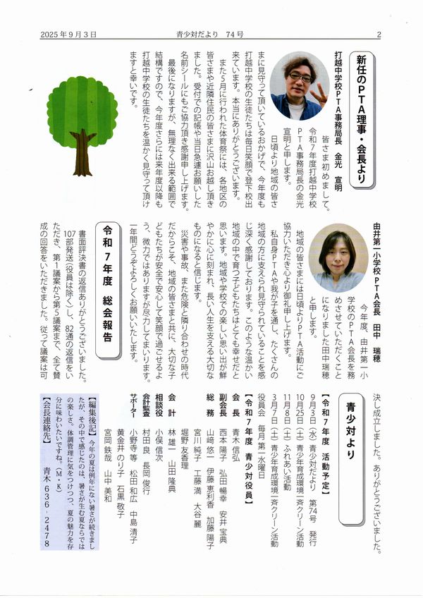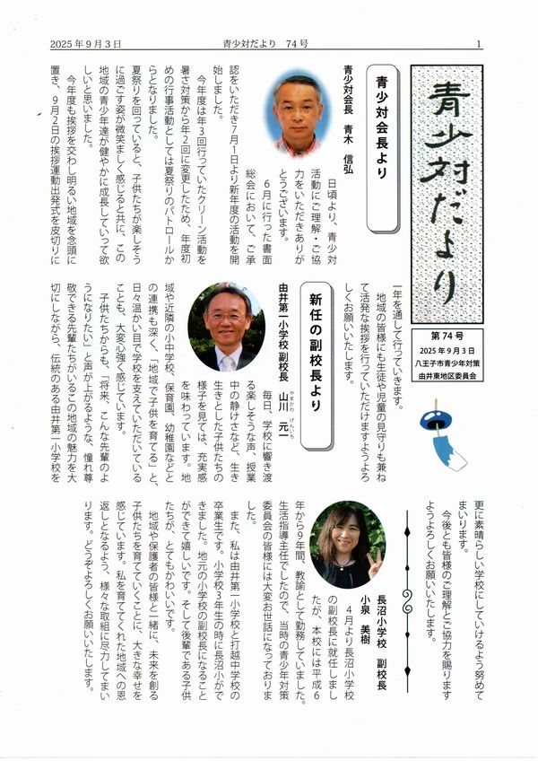 「青少対だより」」第74号です。八王子市青少年対策柚木東地区委員会からです。