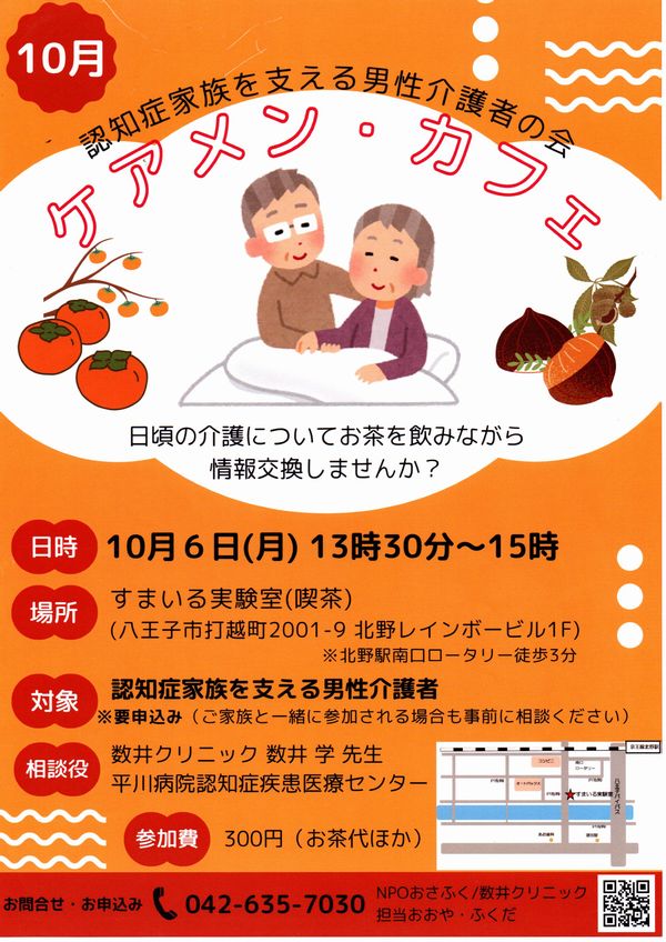 10月6日(月)、認知症家族を支える男性介護者の会「ケアメン・カフェ」が行われます。介護でご苦労されている方、「ケアメン・カフェ」に一度参加してみてはいかがですか。お悩みや聞いてみたいことがあるという方は事前の申し込みを行ってから会場(喫茶すまいる実験室)までお出かけください。