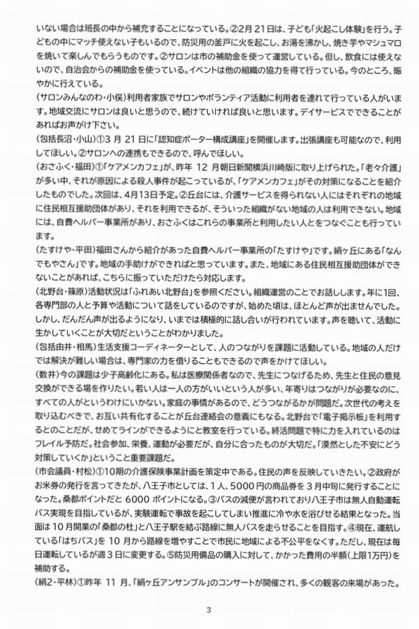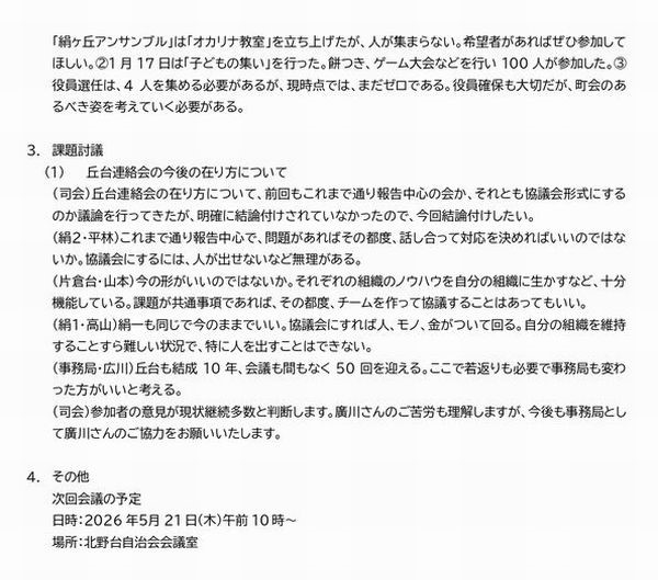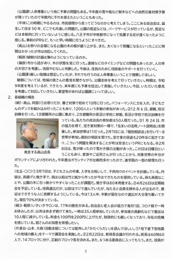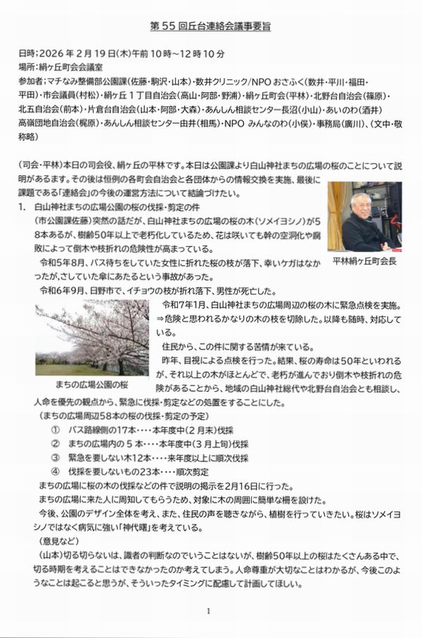 「丘台連絡会」が行われました。(2月19日) 白山神社まちの広場公園の桜の一部が伐採されます。 2月19日(木)、第55回丘台連絡会が絹ヶ丘町会会館で行われました。冒頭、八王子市から白山神社まちの広場公園の桜の木の一部を倒壊の恐れがあるという理由で伐採することになった報告がありました。これから美しく咲く時期になぜという意見が出されましたが、住民の安全を優先した、また代わりの桜を植えることなど説明がありました。その他、各組織報告、課題審議の内容は、以下の議事要旨をご覧ください。 ツイート