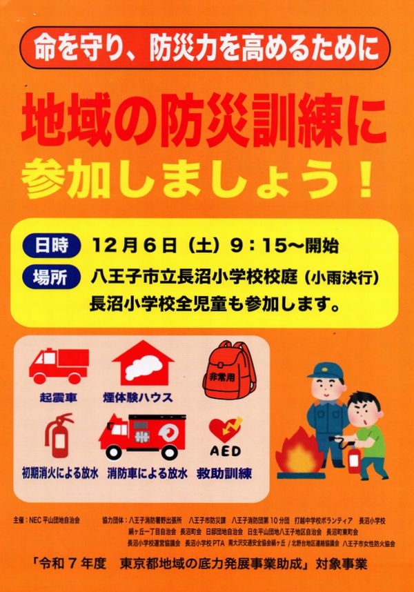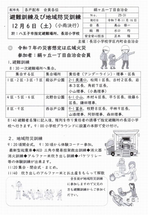 避難訓練は、1次避難場所(各公園)に午前8時30分にお集まりください。その後、2次避難場所の長沼小学校へみんなで避難(移動)いたします。長沼小学校では各種の防災訓練が行われます。皆様のご理解とご協力をお願いいたします。