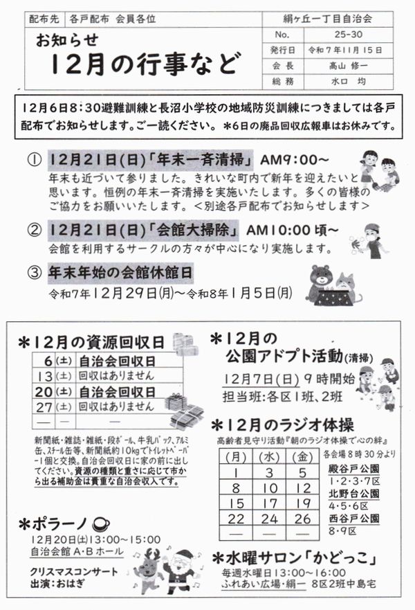 いよいよ12月の予定をお知らせする時期になりました。朝晩は大分寒くなりました。インフルエンザやコロナも流行っています。お身体に十分気を付けて年越しの準備をいたしましょう。12月は、6日(土)に「避難・防災訓練」が、21日(日)に「年末一斉清掃」、「会館大掃除」が行われます。皆様のご協力をお願いいたします。