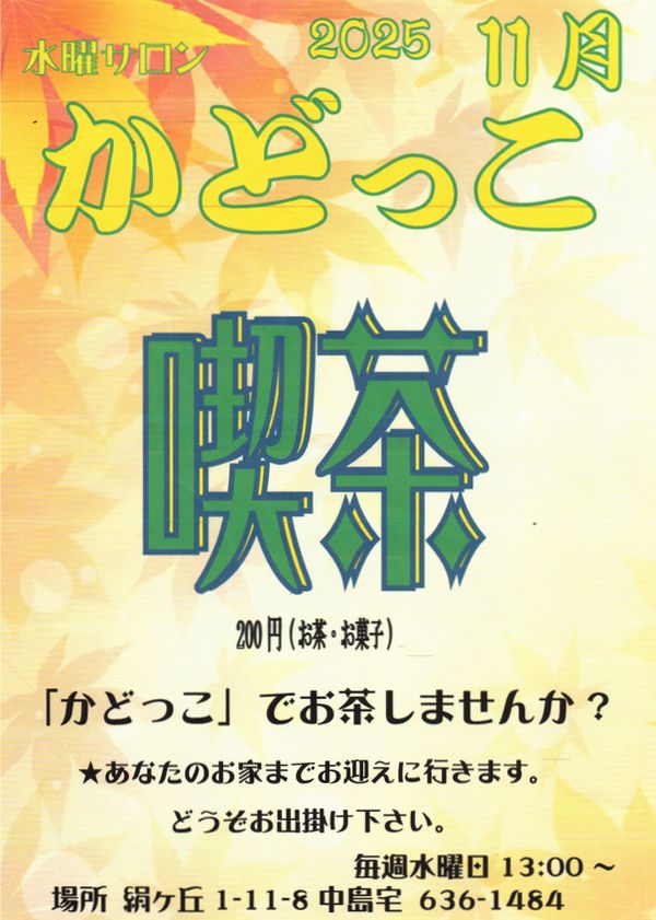 「かどっこ」は毎週水曜日、午後1時から4時まで開店しています。11月の開店日は、5日、12日、19日、26日です。 この時期は、長沼公園の紅葉が見られるいい時期ですが、寒暖の差が大きく油断をすると風邪をひきます。一枚羽織ってお出かけください。 ツイート