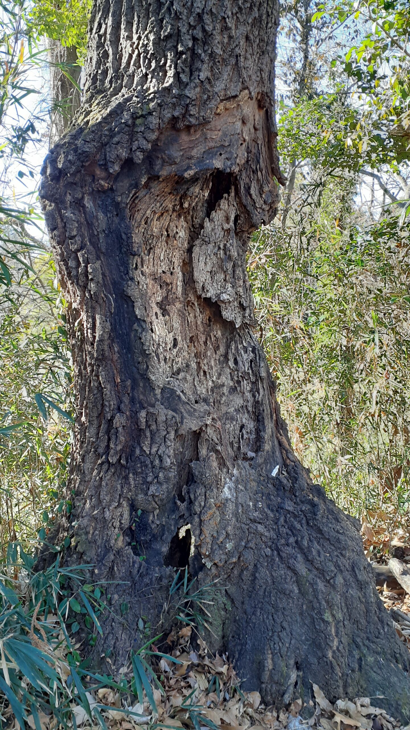 夏休みの子供達をカブト虫、クワガタなど採集に夢中にさせたクヌギの木、今はなんと「頭上注意」のコーンが立っています。
