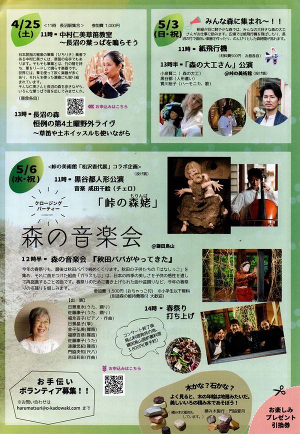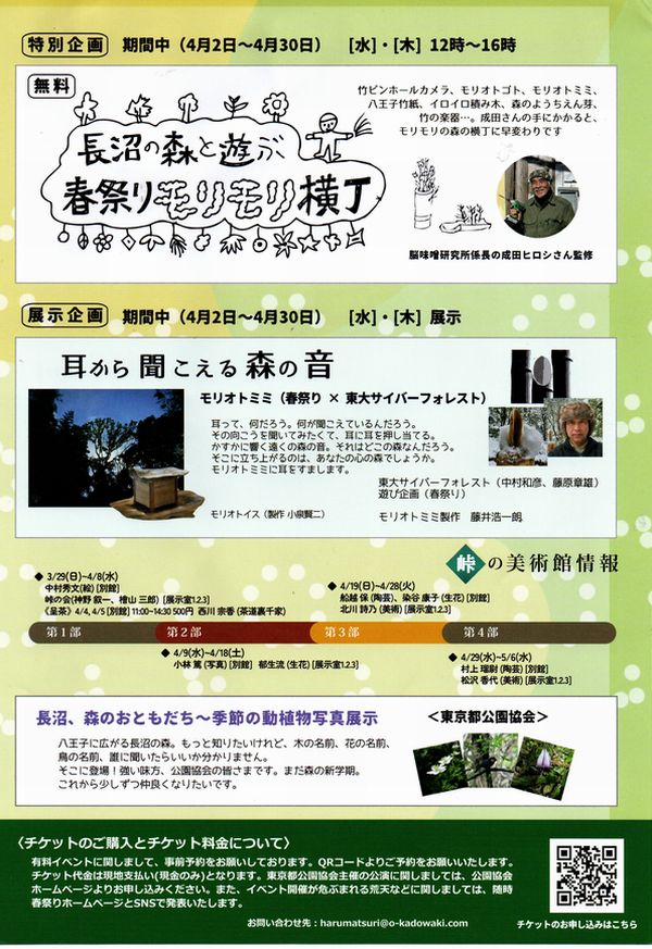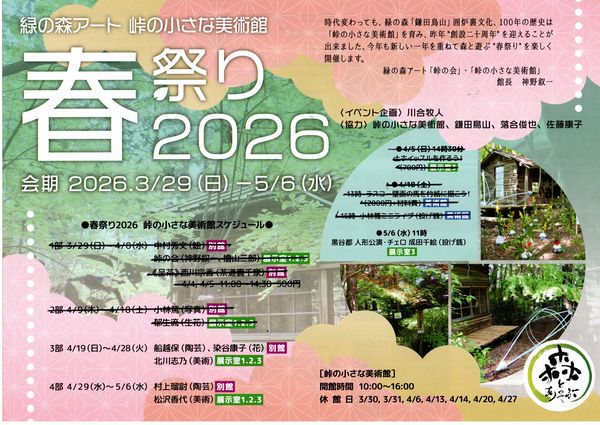 緑の森アート峠の小さな美術館「春祭り2026」も終盤です。 3月28日から始まった「緑の森アート 峠の小さな美術館『春祭り2026』」は、いよいよ終盤ですが、まだまだ、楽しい企画が残っています。桜は終わりましたが、新緑の美しい環境の中で行われているこの行事、足を運んでみてはいかがですか。 Exif_JPEG_PICTURE ツイート