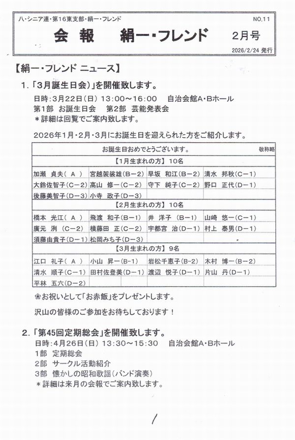 会報 絹一・フレンド2月号です。